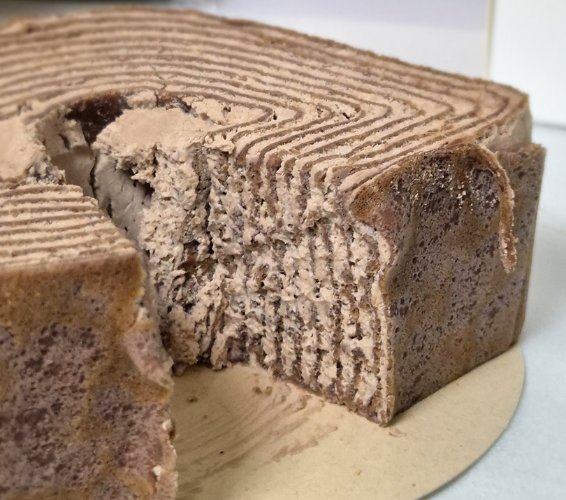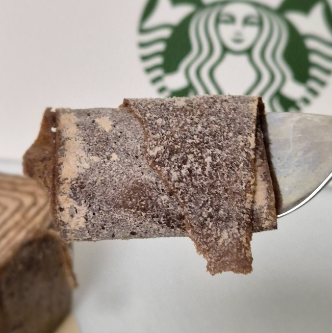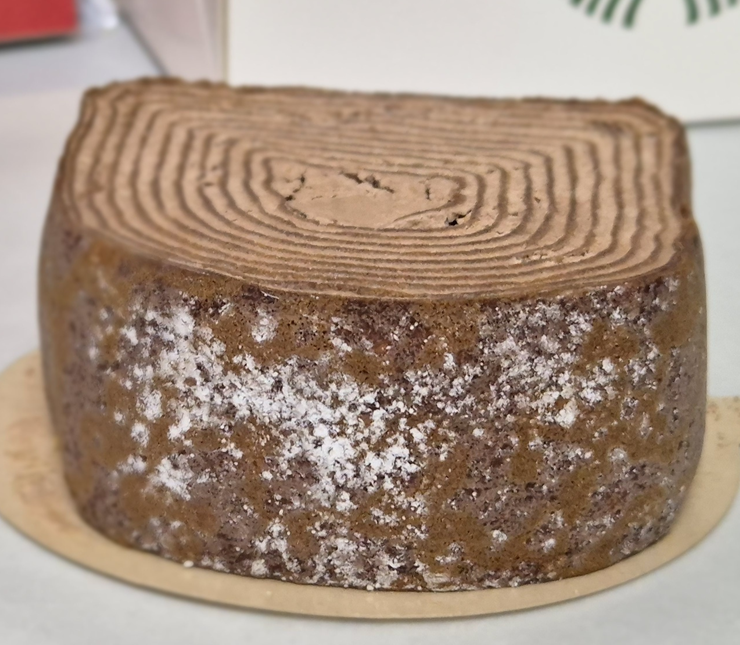 다크 코코아 크레이프에 초코 생크림으로 말아낸 롤케이크를 통나무 단면처럼 보이게 만들어 놨다고 소개를 하고 있습니다. ㅎㅎ 비닐을 벗긴 옆모습을 보니 그럴 듯하네요!ㅎㅎㅎ