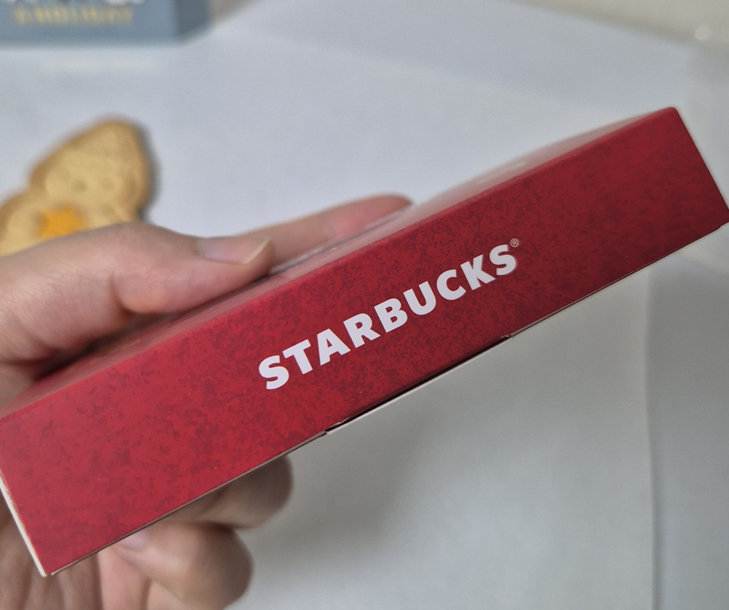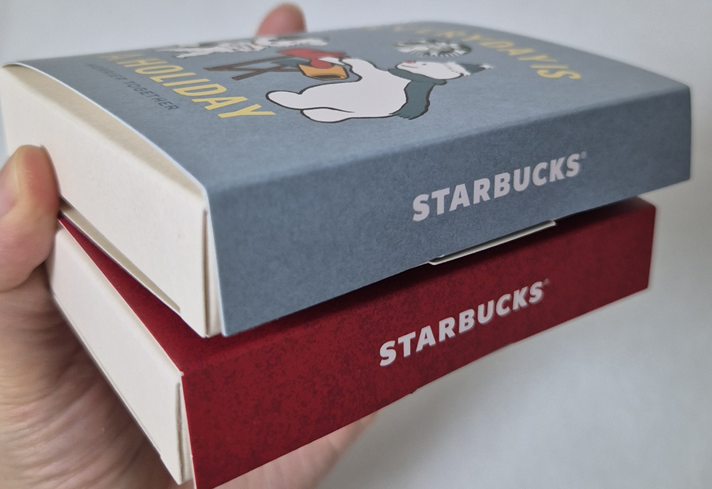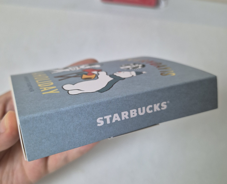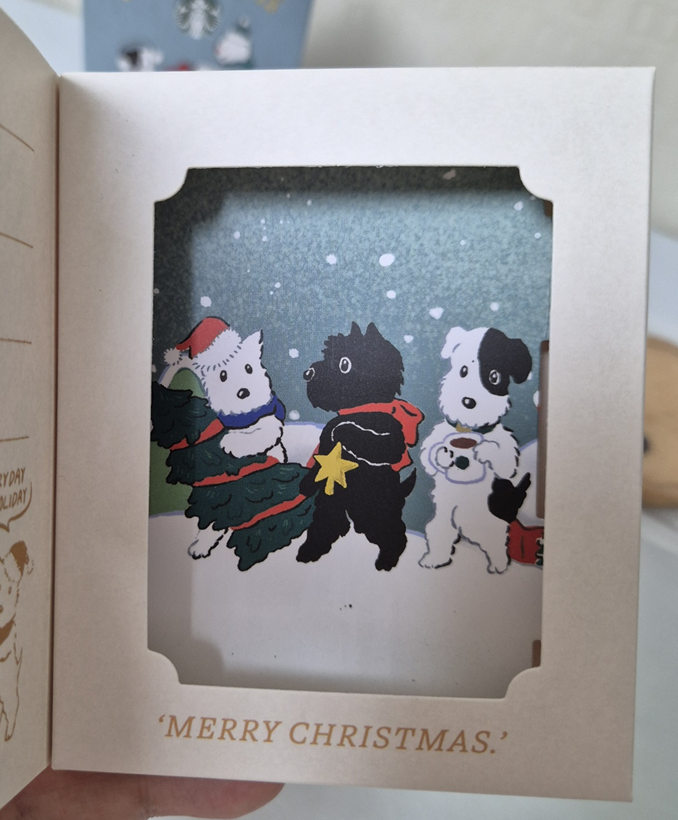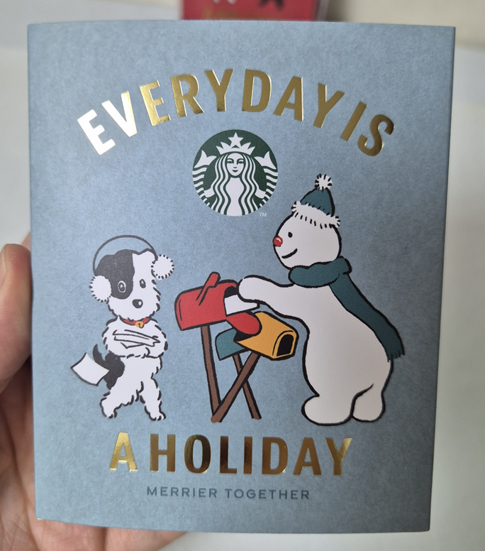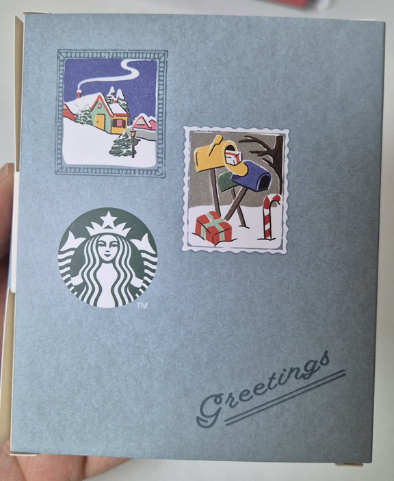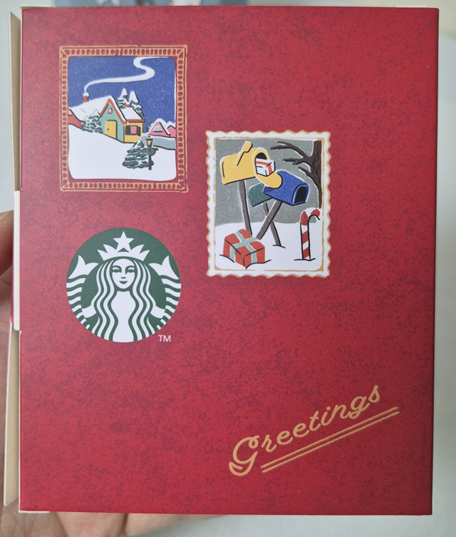 종이 상자 가장 앞에는 강아지, 눈사람 일러스트가 있고 뒤에는 우표 모양의 일러스트와 스타벅스 마크, 옆에는 스타벅스 로고가 있습니다. 패키지도 귀엽고 빈티지스럽게 만들어진 것 같습니다.