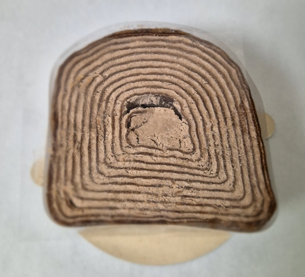 이제 본격적으로 먹어보기 위해 단면을 잘라 봤습니다. 생크림이 균일하고 꽤 도톰하게 겹을 이루고 있었습니다. 이렇게 잘라 보니 오래된 통고목나무 같아 보이네요.ㅎㅎ