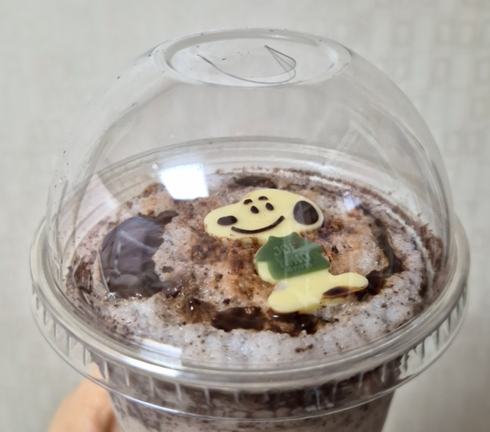 프라푸치노 위로 너무 귀여운 조 카인드 스누피 초콜렛이 올라가 있습니다. ㅎㅎ 스누피 디테일이 꽤 좋은 것 같아요.ㅎㅎ 그런데 생각보다 초콜렛 맛이 뭔가 허전한 것처럼 느껴졌어요. 맛이 없는 것도 아니고 있는 것도 아닌 이도저도 아닌 맛이었습니다...