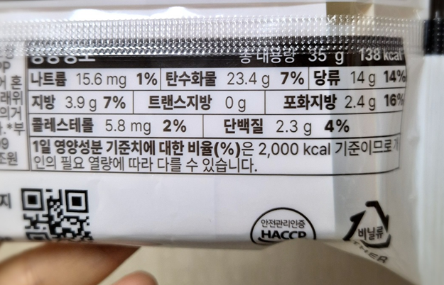 나트륨 (mg/%) 탄수화물(g/%) 당류(g/%) 지방(g/%) 트랜스지방(g) 포화지방(g%) 콜레스테롤(mg/%) 단백질(g/%) 15.6/1 23.4/7 14/14 3.9/7 0 2.4/16 5.8/2 2.3/4