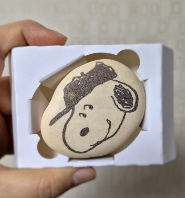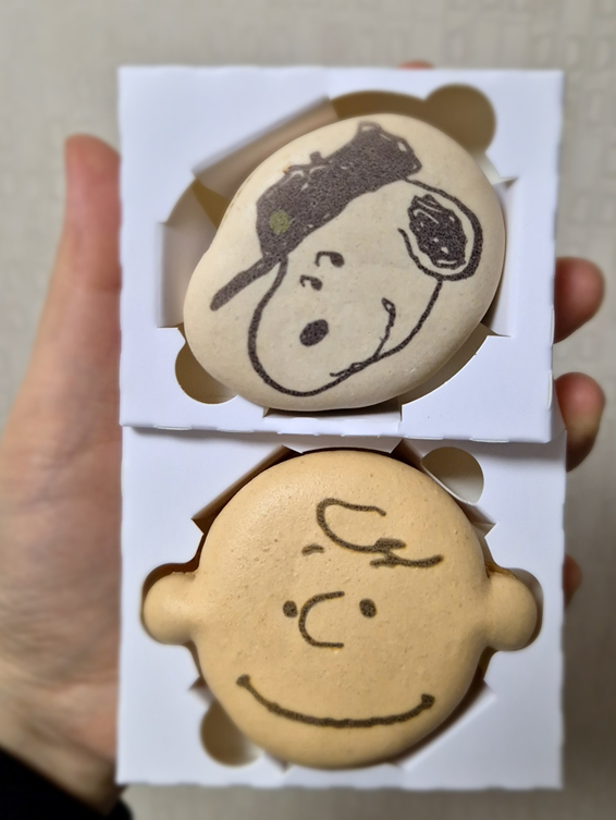 먼저 스누피 마카롱이에요. 타원형 마카롱에 모자를 쓴 스누피 얼굴이 그려져 있습니다.