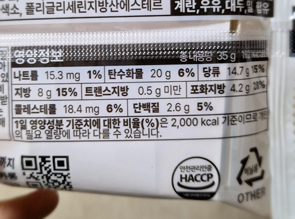 나트륨(mg/%) 탄수화물(g/%) 당류(g/%) 지방(g/%) 트랜스지방(g) 포화지방(g/%) 콜레스테롤(mg/%) 단백질(g/%) 15/3/1 20/6 14.7/15 8/15 0.5g 미만 4.2/28 18.4/6 2.6/5