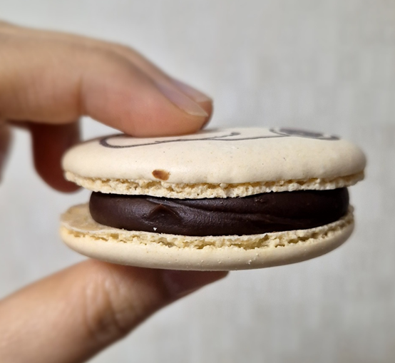 뚱카롱까지는 아니지만 일반적인 마카롱 두께보다 살짝 두꺼운 편이에요. 반으로 갈라 보면 가나슈 초코 필링이 꼬끄 안에 가득한 것이 보입니다. 와 한입 먹었더니 제 입에는 정말 미친 듯이 달았습니다! 그래서 저는 한 입 먹고 더 이상 먹을 수 없었습니다.. 정말 너무 달아서 놀랄 정도였어요.ㅎㅎ 꼬끄는 약간 퍼석한 느낌이 있었습니다. 개인적으로 스누피 마카롱 자체가 정말 제 스타일은 아니었어요.ㅠㅎㅎ