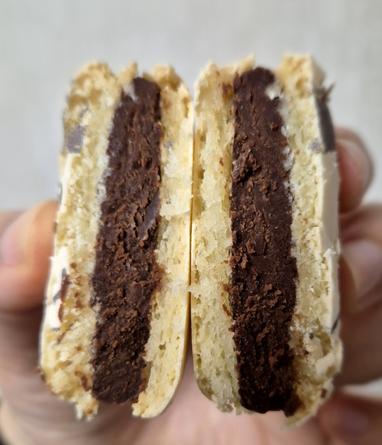 뚱카롱까지는 아니지만 일반적인 마카롱 두께보다 살짝 두꺼운 편이에요. 반으로 갈라 보면 가나슈 초코 필링이 꼬끄 안에 가득한 것이 보입니다. 와 한입 먹었더니 제 입에는 정말 미친 듯이 달았습니다! 그래서 저는 한 입 먹고 더 이상 먹을 수 없었습니다.. 정말 너무 달아서 놀랄 정도였어요.ㅎㅎ 꼬끄는 약간 퍼석한 느낌이 있었습니다. 개인적으로 스누피 마카롱 자체가 정말 제 스타일은 아니었어요.ㅠㅎㅎ