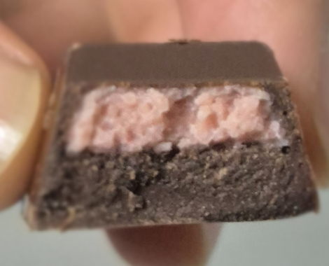 저도 한 조각을 잘라 봤어요.ㅎㅎㅎ 사실 건조 딸기의 흔적을 찾기는 조금 어려웠던 것 같습니다. ㅎㅎㅎ 하지만 딸기 필링이 정말 부드러웠고 새콤하니 맛이 있더라고요!ㅎㅎ 저는 원래 다크나 밀크 초콜릿 아니면 잘 안 먹고 딸기 초콜릿은 더더욱 안 먹는데 그래도 더 먹을 수 있겠더라고요.ㅎㅎ 하지만 2,500원으로 또 사 먹을 것 같진 않습니다. ㅎㅎ