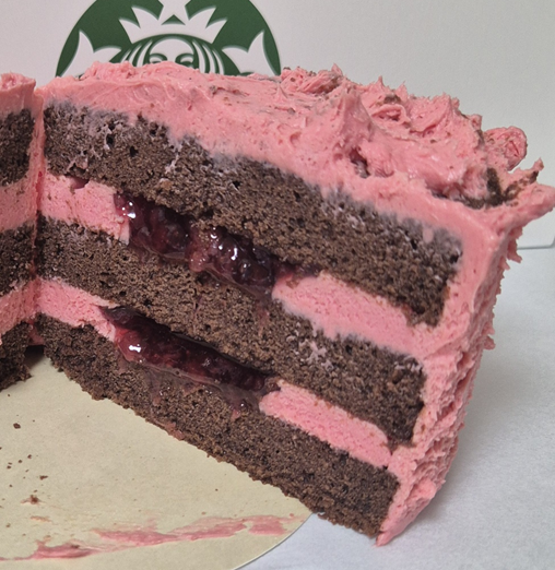 케이크의 단면을 보면 다크 브라운 시트와 분홍 크림 치즈가 켜켜이 쌓여 있고, 가운데 딸기잼이 가득 들어 있습니다!ㅎㅎ