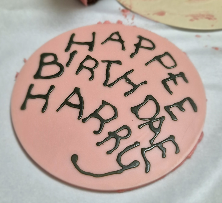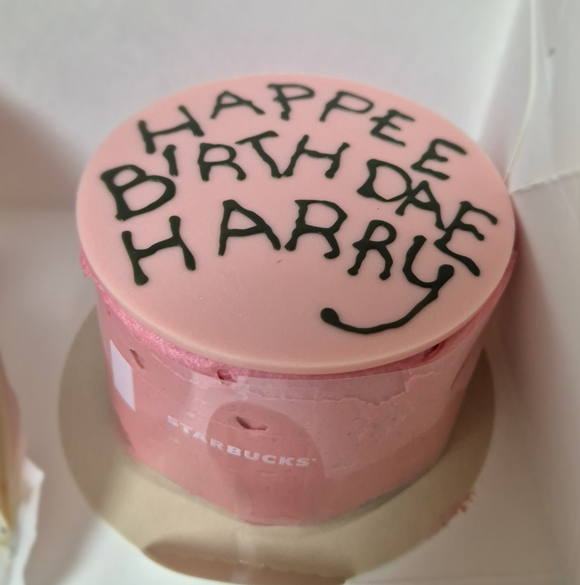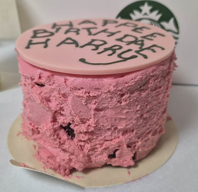 해피버스데이 해리 케이크입니다. 일반 조각 케이크보다는 크지만 CD정도? CD보다는 조금 큰 크기예요! 참고하세요~ 분홍색의 버터 크림으로 발라져 있고, 영화에서 나온 케이크 디자인의 초콜릿이 올라가 있습니다. ㅎ 칼로리가 어마어마하지요!ㅎㅎ