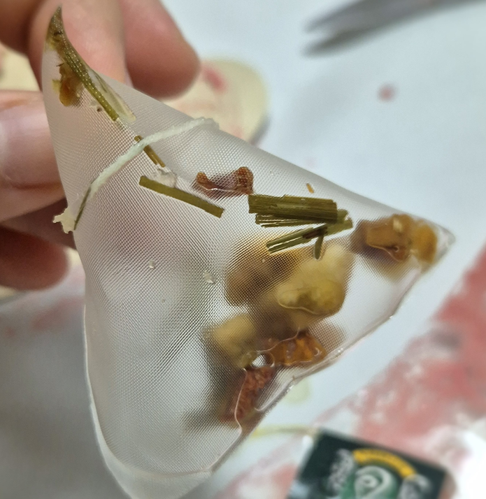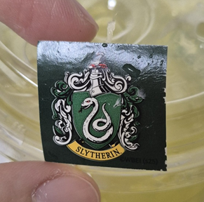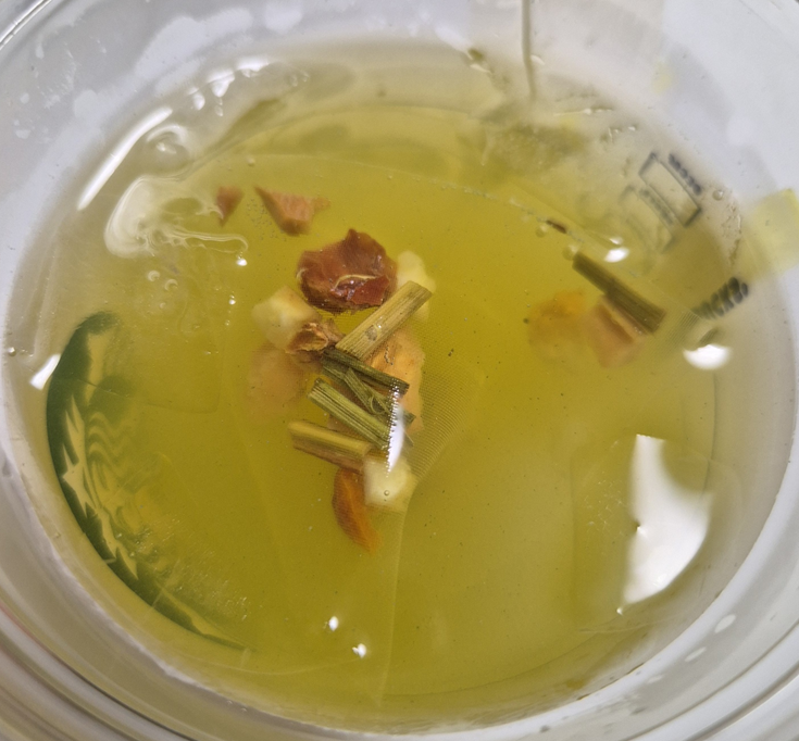 티백의 팁에는 슬리데린 상징이 있어요!ㅎㅎㅎ 티백을 보면 너무 텅텅 비어 있어요.. 마법을 부려서 티를 우리는 건가, 티백 망을 우리는 건가 너무 비어 있는 티백을 보고 깜짝 놀랐는데 물어보니 원래 초록색 천연 색소를 넣은 브리틀이 들어 있는데 차차 녹아 사라진다고 하네요! 그래서 중요한 것은!! 내부가 흰 텀블러는 이염될 수 있다고 해요!! 꼭 참고하세요!!!! ㅎㅎ 그리고 녹차다 보니 2mg 카페인이 들어 있다고 하니 참고하세요!! 티백에는 건조된 사과, 파인애플, 오렌지, 레몬 그라스가 들어 있다고 합니다. ㅎ
