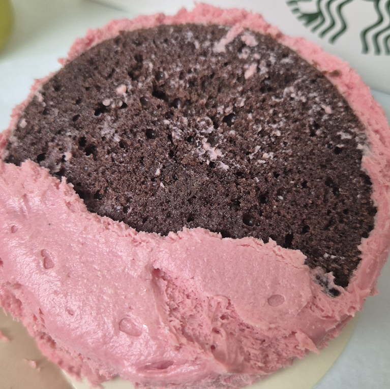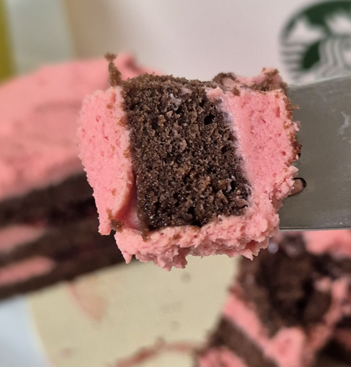 케이크의 단면을 보면 다크 브라운 시트와 분홍 크림 치즈가 켜켜이 쌓여 있고, 가운데 딸기잼이 가득 들어 있습니다!ㅎㅎ