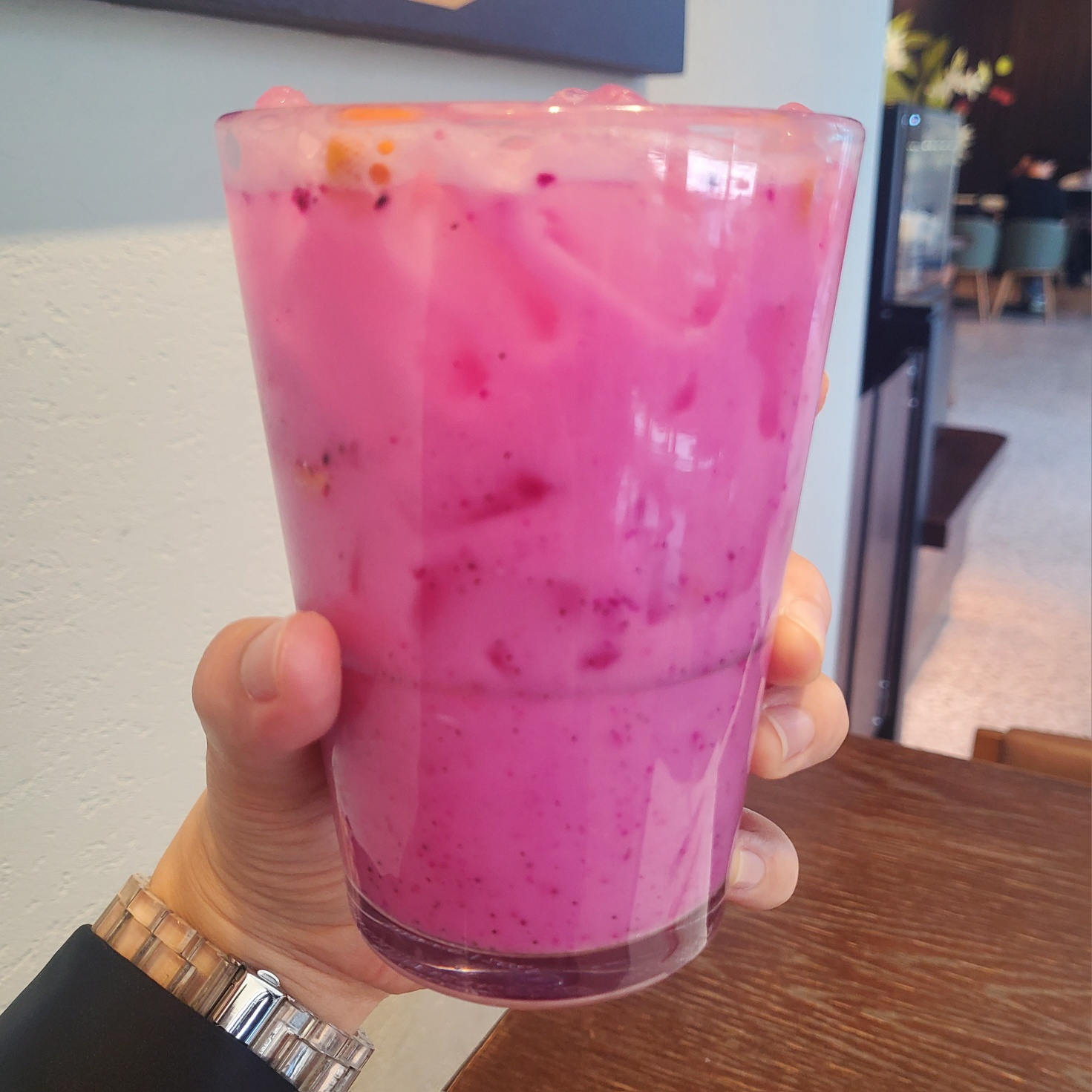 저의 닉네임을 부르는 소리에 달려가 받은 음료입니다! 지난 망고 용과 레모네이드 처럼 분홍빛의 예쁜 색감을 띄고 있어요.ㅎㅎ 지난번보다는 용과 씨가 알알이 잘 보이네요!ㅎㅎ 마치 딸기우유와 같은 비주얼입니다!