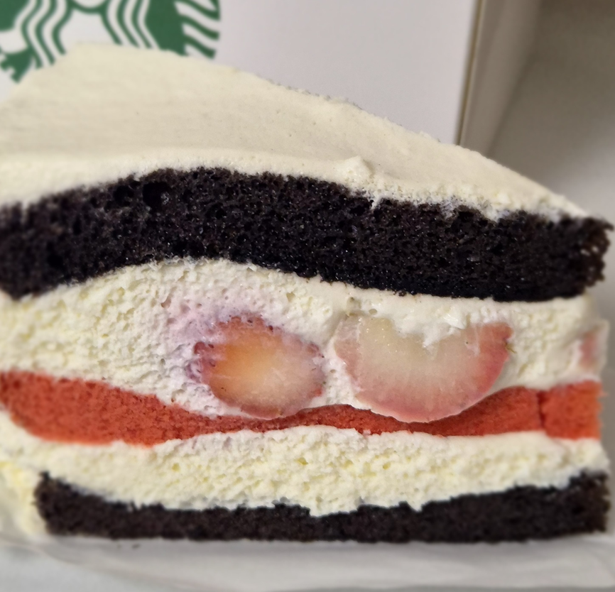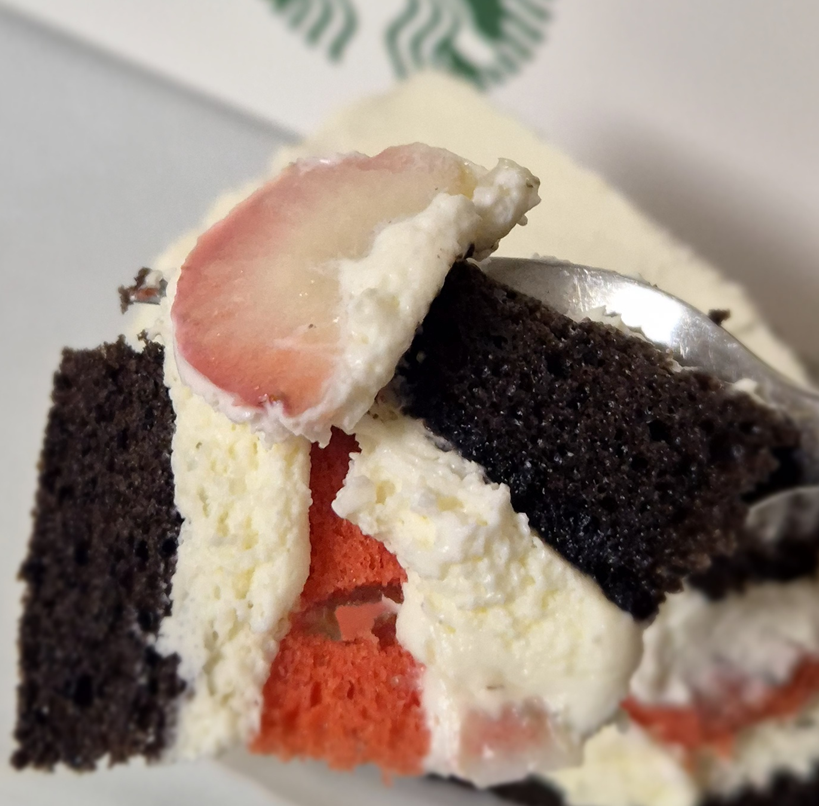 초코 시트 사이에 생크림과 생딸기가 켜켜이 쌓여 있는 케이크입니다.ㅎ 초코 시트는 먹자마자 초코의 맛이 강했고, 딸기 시트는 딸기 맛이 확! 와닿았어요.ㅎㅎ 각각 따로 먹으면 초코 케이크만, 딸기 케이크만 먹는 기분이었습니다.ㅎㅎ 두 시트와 크림, 딸기까지 먹어도 다른 맛이 따로 놀지 않고 이질감 없이 한 메뉴의 맛으로 느껴졌어요.ㅎㅎㅎ