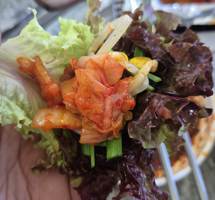 오리고기에 김치, 콩나물, 부추 모두 함께 싸 먹으면 향긋하면서 느끼하지 않게 먹을 수 있었습니다.ㅎㅎㅎ