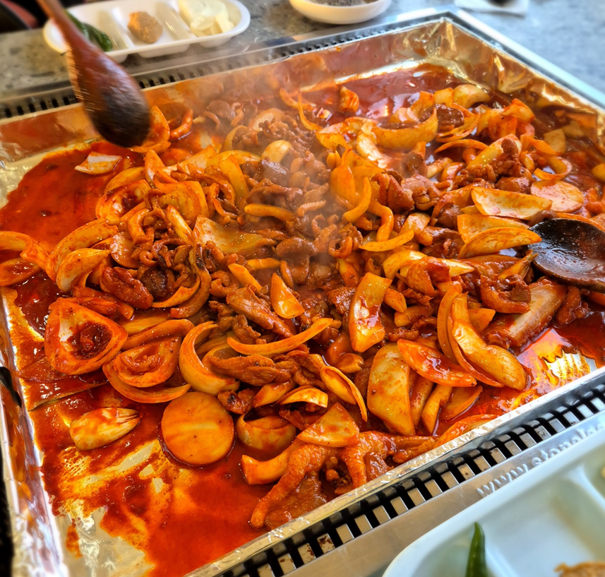 때깔 고운 주물럭이 준비되어 있었는데 참고로 14번 테이블은 불판이 삐뚤어져서 안 좋았어요.ㅠㅠ 기름이 자꾸 한쪽으로 쏠려서 고기가 말랐습니다. 참고하세요!!