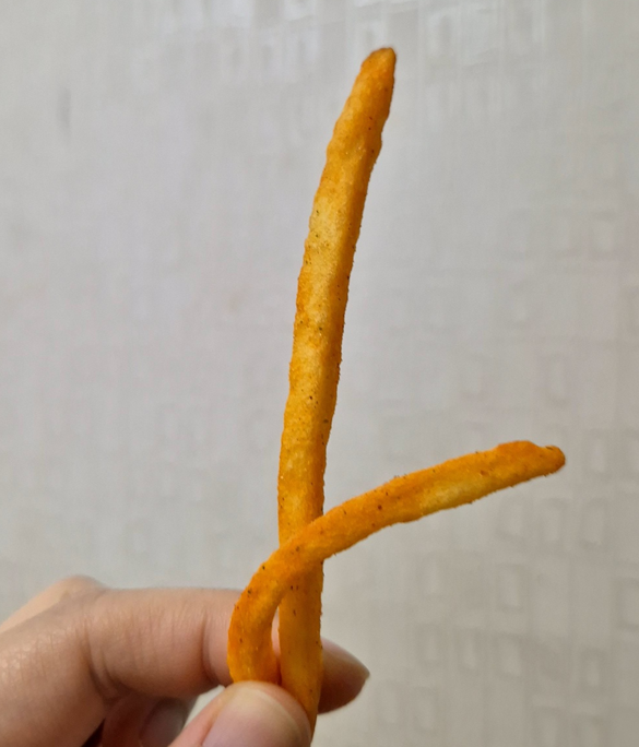 작은 봉지이지만 봉지에 한 가득 감자 스틱이 들어 있습니다. 봉지를 뜯자마자 매콤한 향이 확 올라오더라고요.