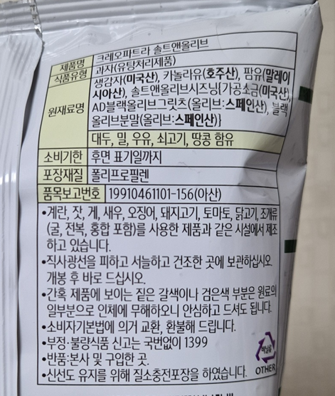 상당히 올리브향이 강한데 올리브향이 살짝 인공적이었던 것 같습니다. 그래서 조금 먹다가 질리는 것 같았어요. 아마 올리브를 좋아하시는 분이라면 좋아하실 것 같은데 저는 아직 못 먹고 그대로 남겨 두게 됐어요.ㅠㅎㅎ