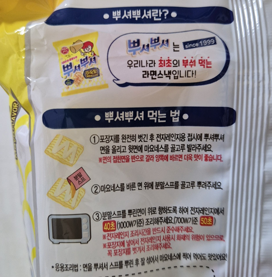 전자레인지에 돌려 먹는 방법뿐만 아니라 원래 뿌셔뿌셔를 먹듯이 면을 부신 후 분말스프를 잘 섞어서 마요네즈를 찍어 먹어도 맛있다고 합니다.