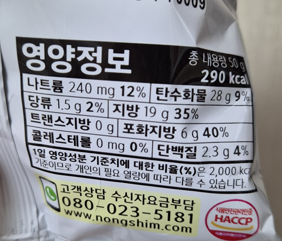 나트륨(mg/%) 탄수화물(g/%) 당류(g/%) 지방(g/%) 트랜스지방(g/%) 포화지방(g/%) 콜레스테롤(mg/%) 단백질(g/%) 240/12 28/9 1.5/2 19/35 0 6/40 0 2.3/4