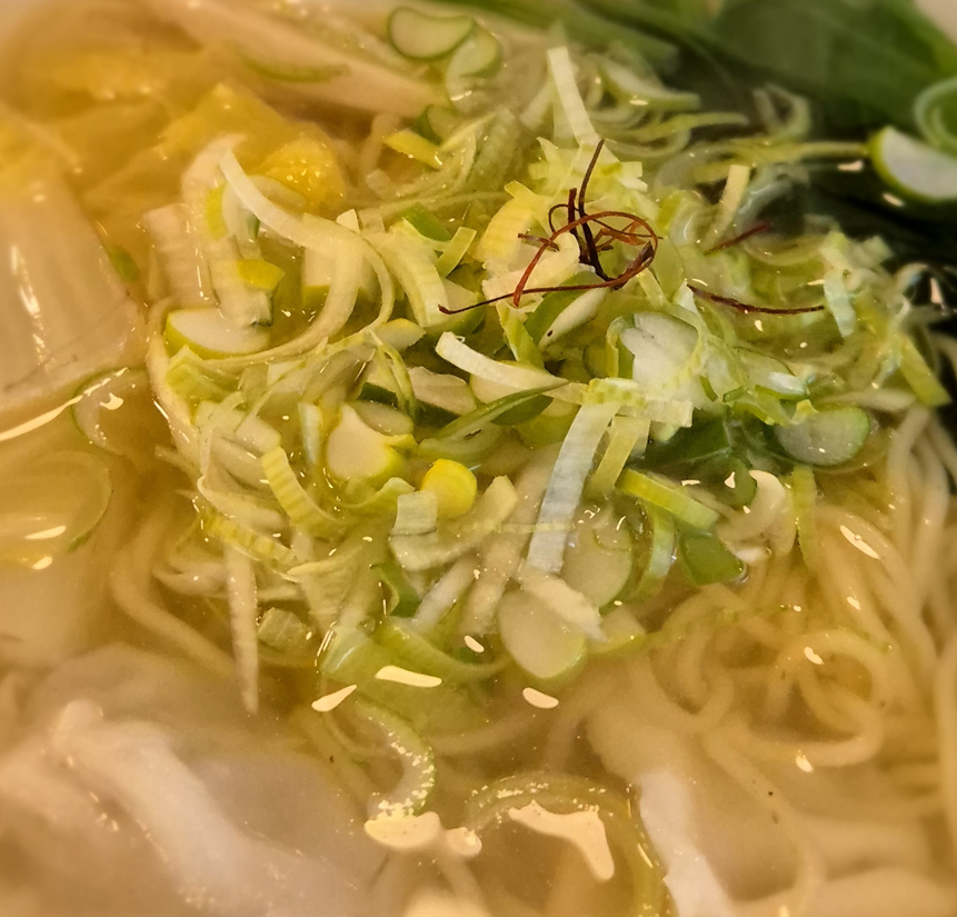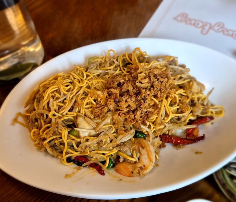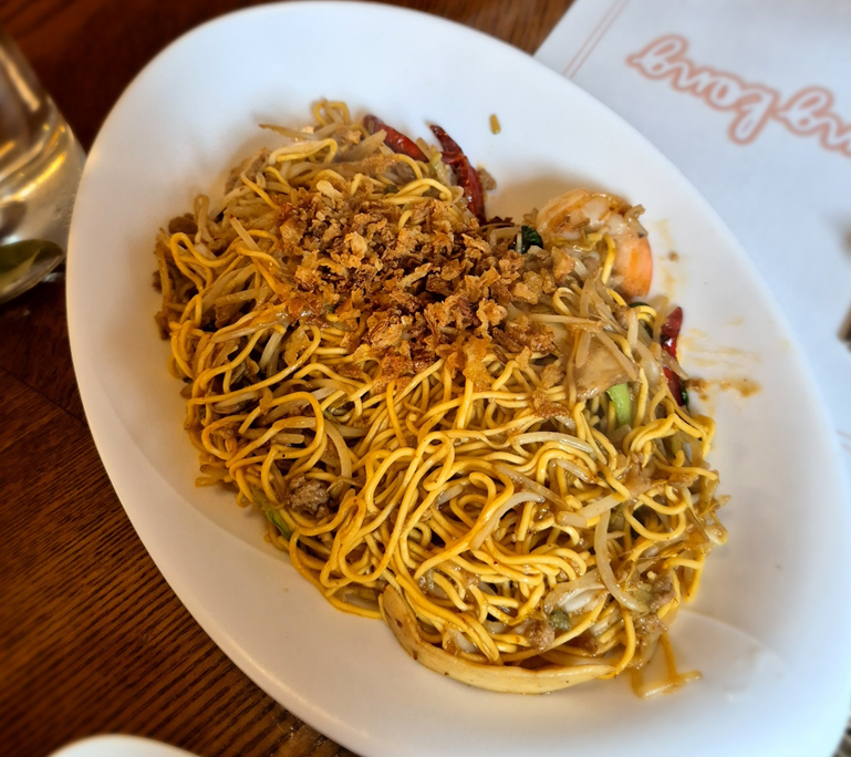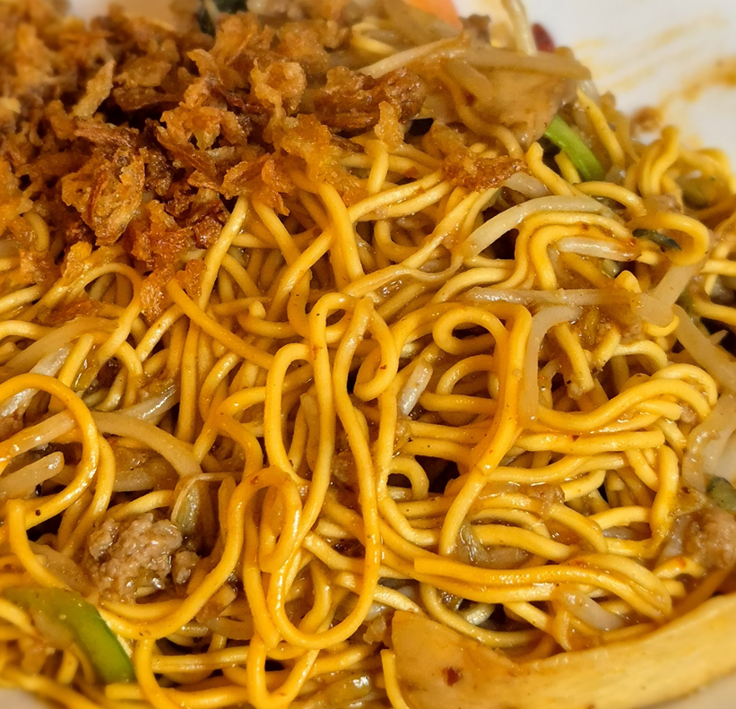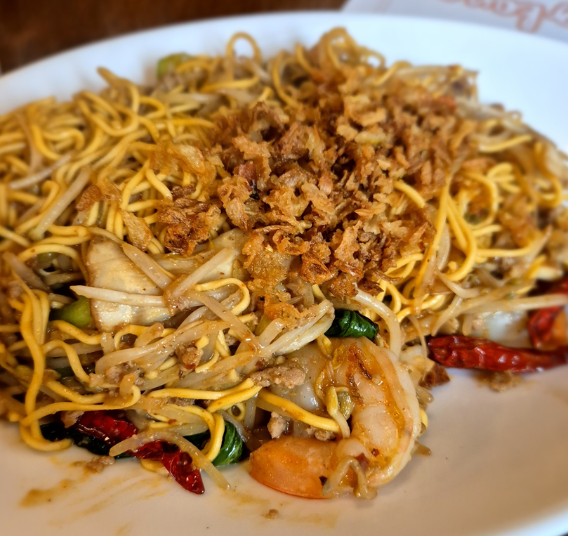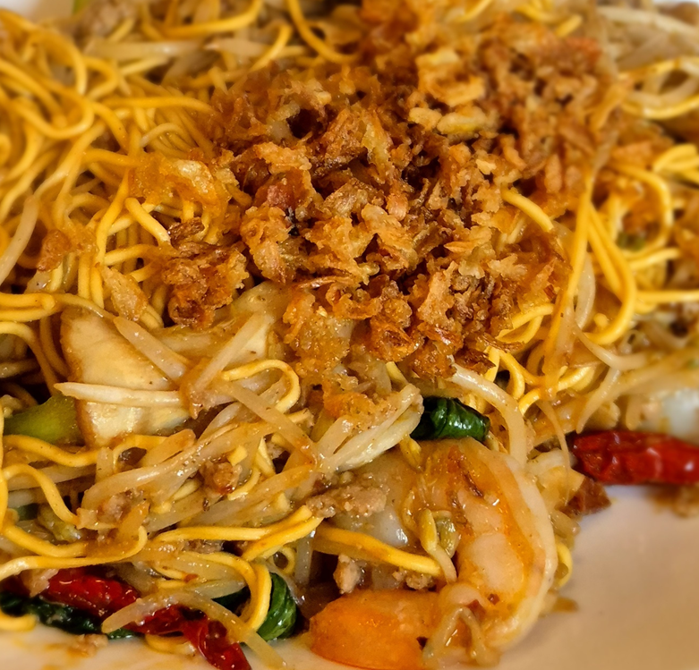 잘 볶아진 에그누들 위로 양파 후레이크가 소복하게 쌓여 있습니다. 큼직한 새우도 함께 볶아 있어요.