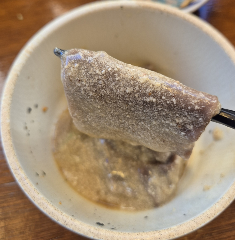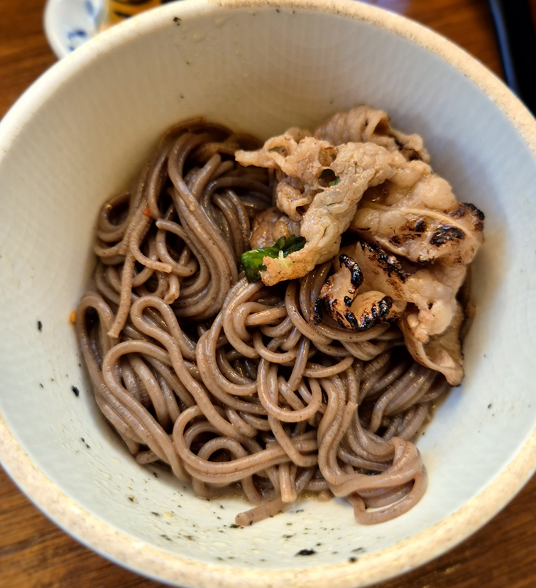 덩어리가 꽤 큰 소고기가 정말 많이 들어가 있었어요.ㅎㅎ 세 명이 먹었음에도 고기가 계속 나왔습니다.ㅎㅎ 달달하니 짭쪼름한 고기 국물에 가장 기본으로 먹기 편한 메뉴였습니다.ㅎㅎ 고기도 질기지 않았고 숯불향이 입 안에서 퍼지면서 담백한 소바와 잘 어울렸습니다.ㅎㅎ