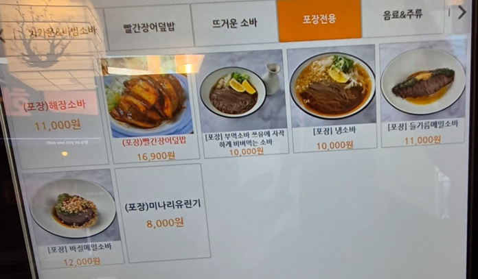 메뉴는 크게 세 가지 카테고리로 나뉘고 포장도 따로 선택할 수 있습니다.ㅎㅎ 저는 세 명이 함께 가서 들기름 메밀 소바, 소고기 온소바, 들깨 납작 소바, 미나리 유린기를 주문했어요.ㅎㅎ