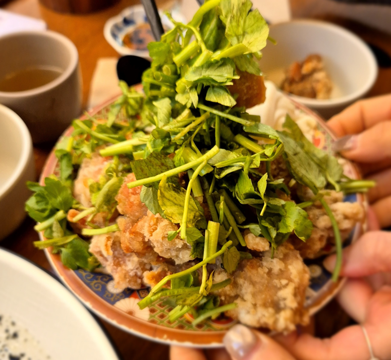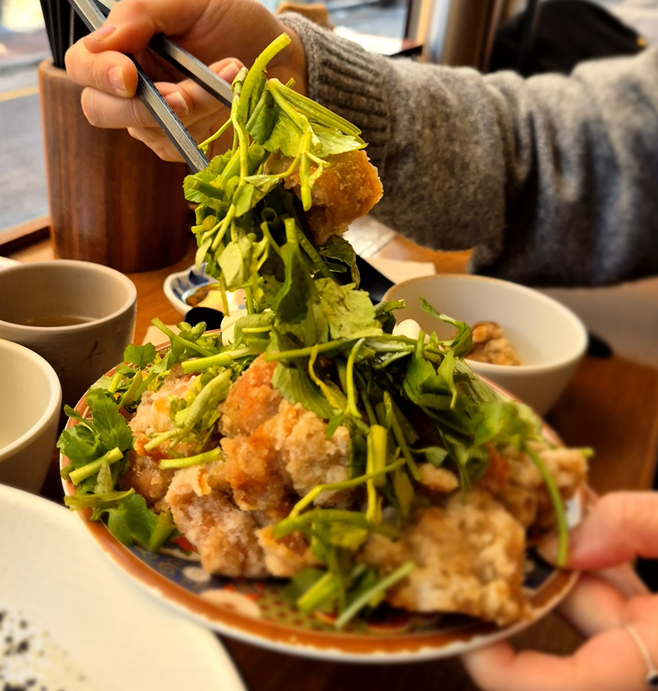 게다가 양배추, 미나리와 함께 먹으면 향긋함이 더 가미되어서 튀김의 느끼함도 없고 깔끔하게 먹을 수 있었습니다. ㅎㅎ 미나리가 없었다면 조금 아쉬웠을 것 같더라고요! 사실 미나리 상태는 그렇게 좋아 보이진 않았는데 그럼에도 같이 먹어야 맛있어서 맛있게 먹었습니다.ㅎㅎ