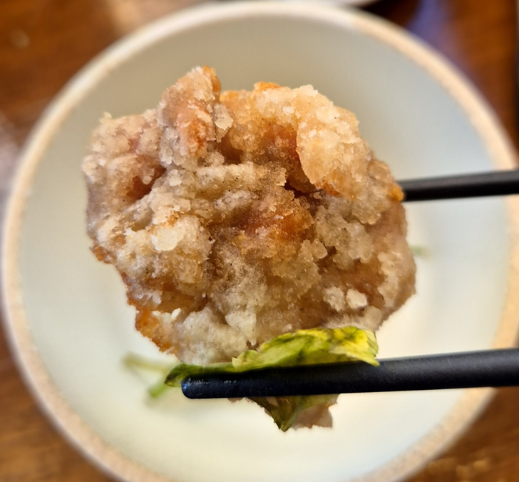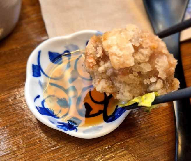 꽤나 큰 닭고기 살을 튀겼는데 닭냄새도 안 나고 바삭하게 잘 튀겨졌어요!ㅎㅎ 튀김 옷이 두껍지도 않은데 바삭하고, 속은 촉촉했습니다. ㅎㅎㅎ 폰즈 소스에 찍어 먹으면 맛이 더 좋아집니다.ㅎㅎ