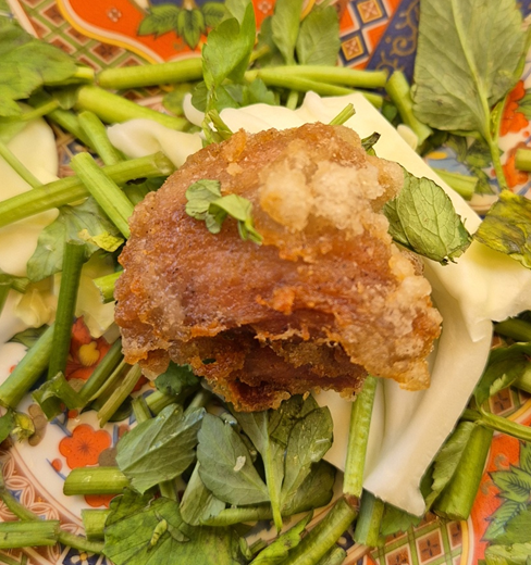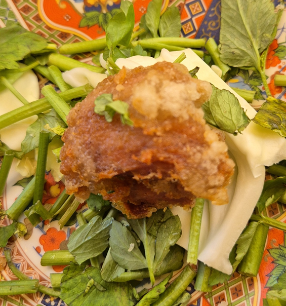 게다가 양배추, 미나리와 함께 먹으면 향긋함이 더 가미되어서 튀김의 느끼함도 없고 깔끔하게 먹을 수 있었습니다. ㅎㅎ 미나리가 없었다면 조금 아쉬웠을 것 같더라고요! 사실 미나리 상태는 그렇게 좋아 보이진 않았는데 그럼에도 같이 먹어야 맛있어서 맛있게 먹었습니다.ㅎㅎ