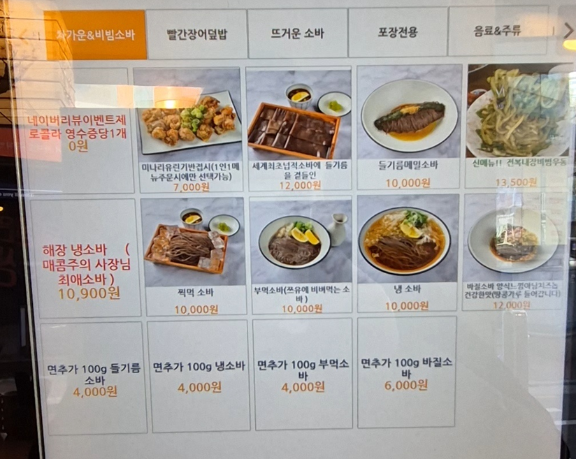 메뉴는 크게 세 가지 카테고리로 나뉘고 포장도 따로 선택할 수 있습니다.ㅎㅎ 저는 세 명이 함께 가서 들기름 메밀 소바, 소고기 온소바, 들깨 납작 소바, 미나리 유린기를 주문했어요.ㅎㅎ