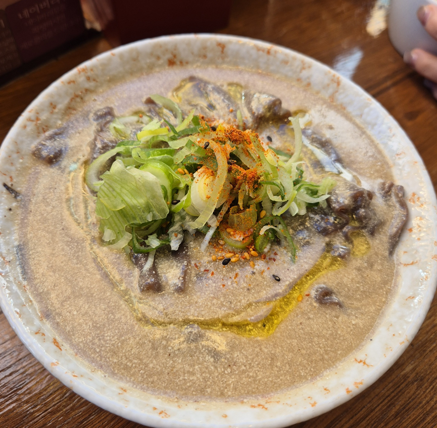 메밀로 만들어진 납작한 면들이 뽀얀 국물에 숨겨 있습니다.ㅎㅎㅎ