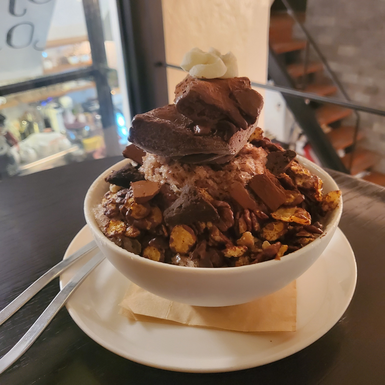 젤라또의 양도 한 스쿱이 아닌 꽤 큰 덩어리가 올라가 있었어요! 갈린 얼음 위로 초코가 묻은 플레이크가 아낌없이 뿌려져 있었고, 그 위로 초콜릿, 호두, 브라우니들도 골고루 토핑되어 있었습니다.