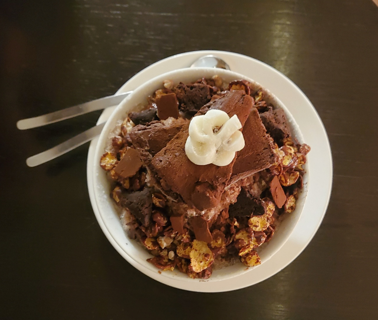 젤라또의 양도 한 스쿱이 아닌 꽤 큰 덩어리가 올라가 있었어요! 갈린 얼음 위로 초코가 묻은 플레이크가 아낌없이 뿌려져 있었고, 그 위로 초콜릿, 호두, 브라우니들도 골고루 토핑되어 있었습니다.