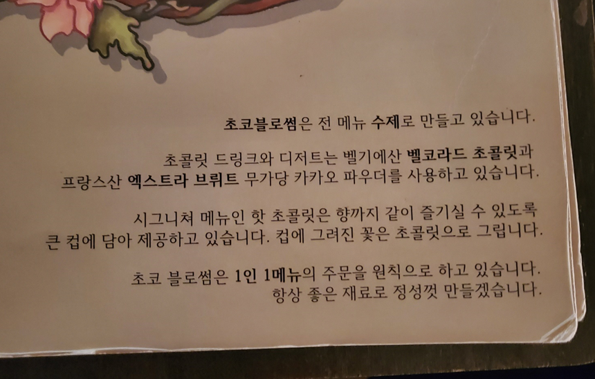 메뉴판에 있는 안내입니다! 전 메뉴를 수제로 만들고 있다고 하네요! 수제 초콜릿을 가까운 곳에서 먹을 수 있었네요!