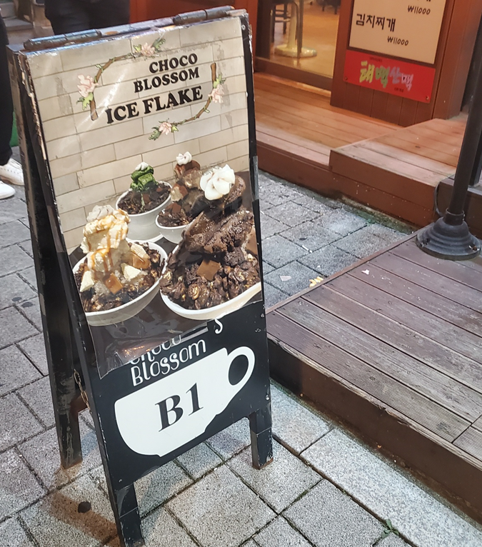 달달하면서 시원한 걸 찾으며 걷던 날이었습니다. ㅎㅎ 친구가 놀러 와서 맛있는 것 먹고 색다른 디저트를 먹고 싶어서 신촌 거리를 걷던 중 저게 뭐지? 하면서 자연스럽게 이끌렸던 카페 <초코 블라썸>입니다!