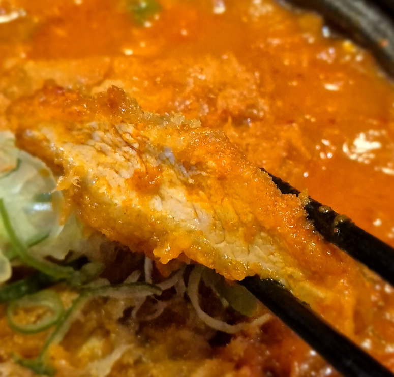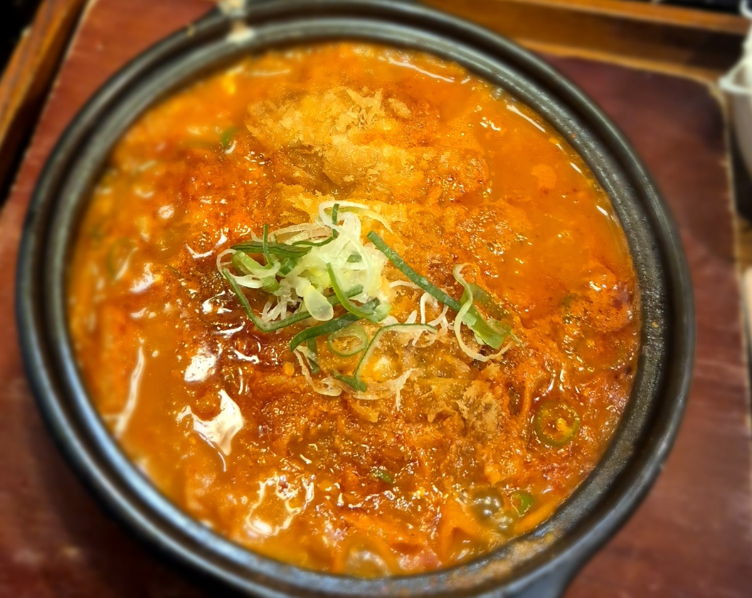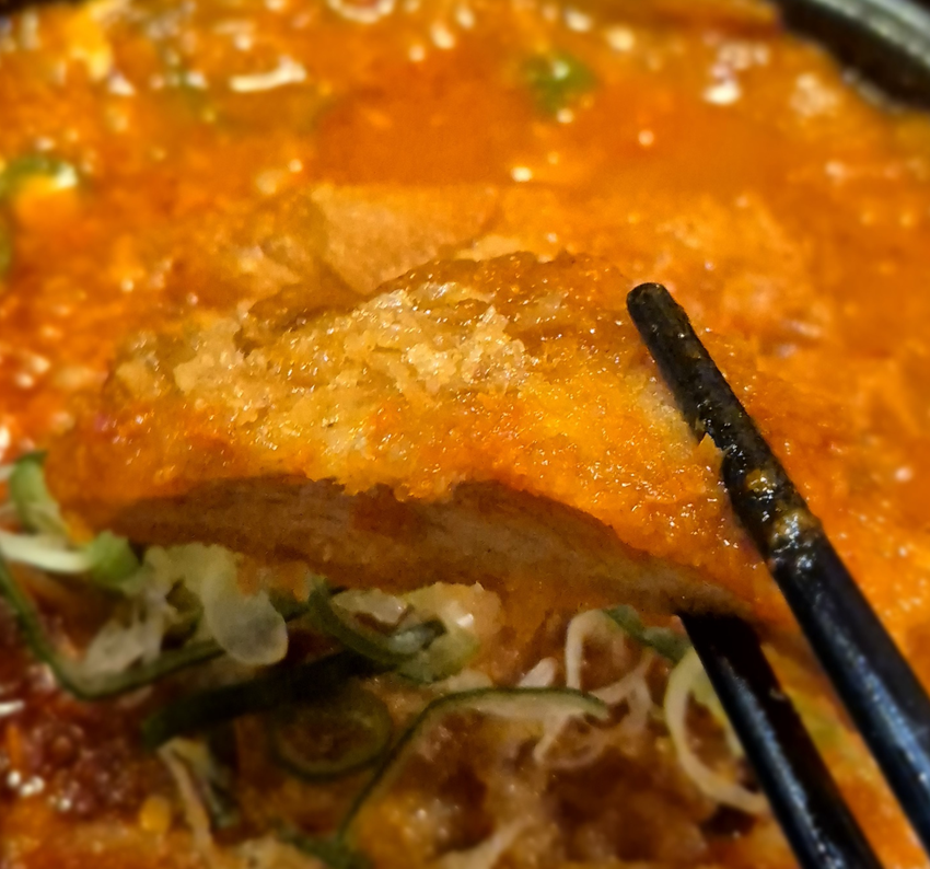 먹음직스러운 김치 위로 돈가스가 올라가 있습니다. 돈까스가 들어간 상태로 한참 끓여져 나온 것 같아요.