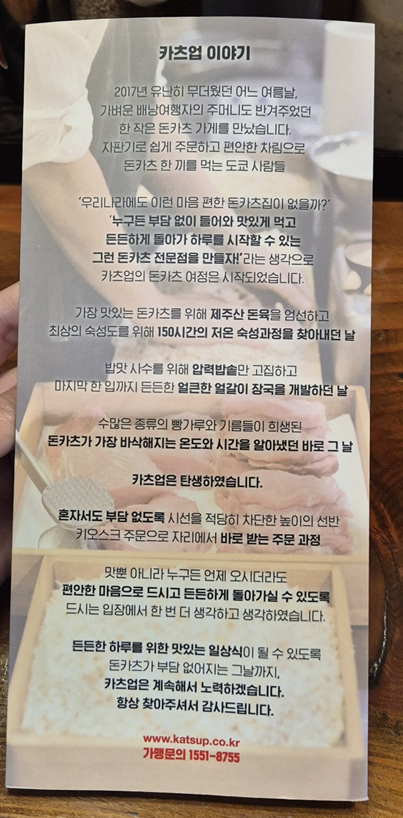 퇴근하면서 동료 선생님과 함께 식사하게 되어 방문하게 된 카츠업입니다. 작은 식당인데 손님이 끊임없이 들어오더라고요. 현대백화점 바로 옆에 있어서 찾기 어렵지는 않았습니다.