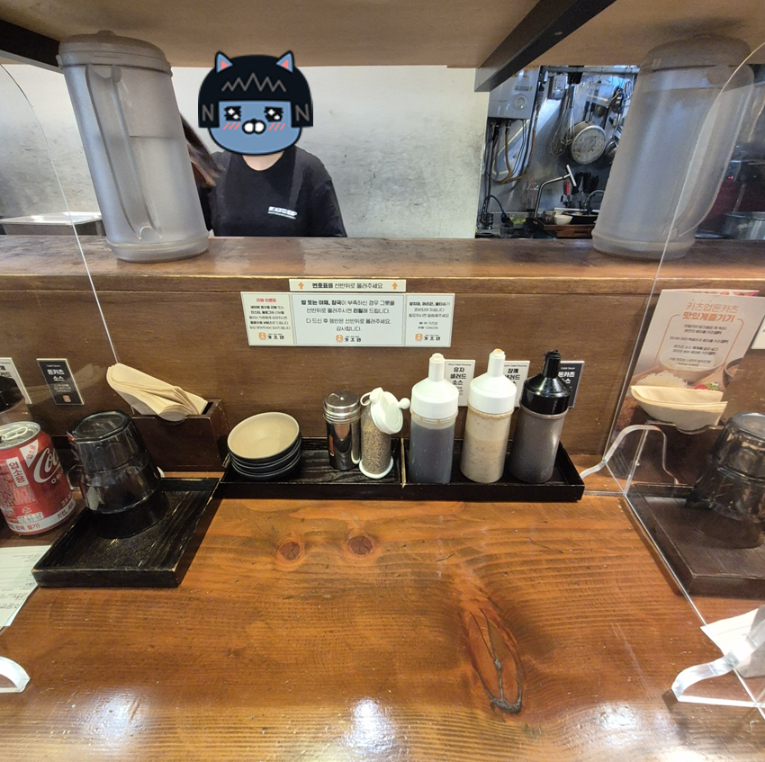 자리를 안내 받으면 각종 소스가 있는 개인 자리에 앉을 수 있습니다. 조금 불편했던 건 코로나 시대 봤었던 아크릴 칸막이가 있는데 좁은 공간에 더 좁더라고요. 개인 자리 공간 확보를 위해 둔 것도 어느 정도 이유가 있을 것 같습니다.