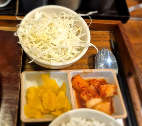조금 기다리면 선반 위로 한상이 나옵니다. 꽤 무겁고 나무라 물이 묻으면 마찰 때문에 이동이 조금 힘드니 조심하셔야 해요. 저는 김치카츠나베를 주문했고 단무지, 김치, 샐러드, 밥이 기본으로 나옵니다.