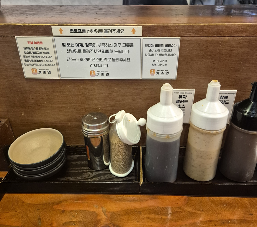 자리를 안내 받으면 각종 소스가 있는 개인 자리에 앉을 수 있습니다. 조금 불편했던 건 코로나 시대 봤었던 아크릴 칸막이가 있는데 좁은 공간에 더 좁더라고요. 개인 자리 공간 확보를 위해 둔 것도 어느 정도 이유가 있을 것 같습니다.