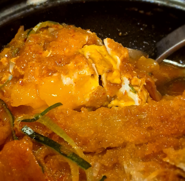 돈가스 밑에 계란이 들어가 있는데 저는 살짝만 익힌다는 걸 너무 익혔더라고요.ㅎㅎ 살짝 익혀 밥과 함께 비벼 먹으면 정말 맛있는데 조금 익은 상태도 나쁘지 않았습니다.