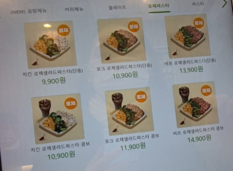 곰탕메뉴, 커리메뉴, 플레이트, 로제파스타, 파스타, 보울, 더블보울, 무지방 그릭요거트, 음료 탭으로 메뉴가 정리되어 있습니다. 저는 로제 파스타에서 비프 로제 샐러드 파스타를 주문했습니다.