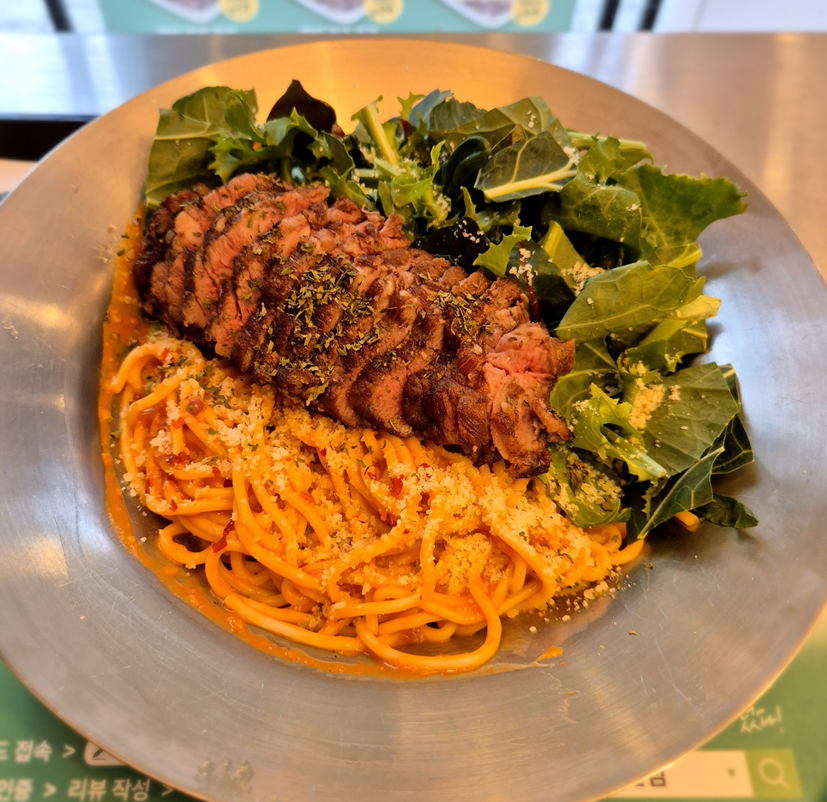 제가 주문한 비프 로제 샐러드 파스타입니다. 넓은 접시 위에 파스타와 샐러드, 비프가 가득 담겨 있습니다.