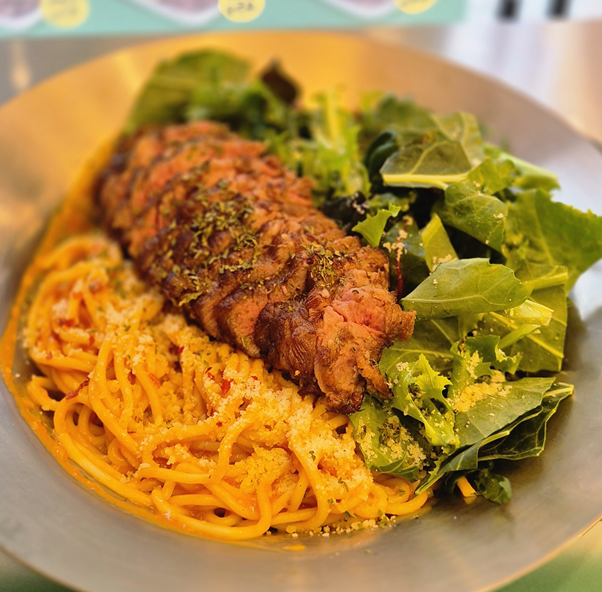 제가 주문한 비프 로제 샐러드 파스타입니다. 넓은 접시 위에 파스타와 샐러드, 비프가 가득 담겨 있습니다.