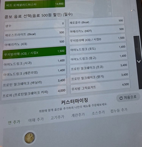 메뉴를 고르면 커스터마이징을 할 수 있습니다. 저는 딱히 추가하지 않고 생수만 선택했습니다. 생수는 콤보와 큰 차이가 없더라고요!
