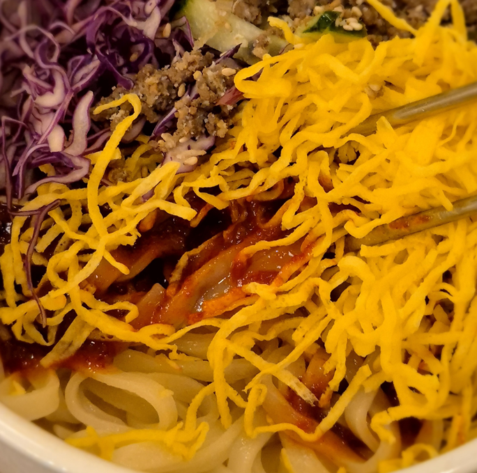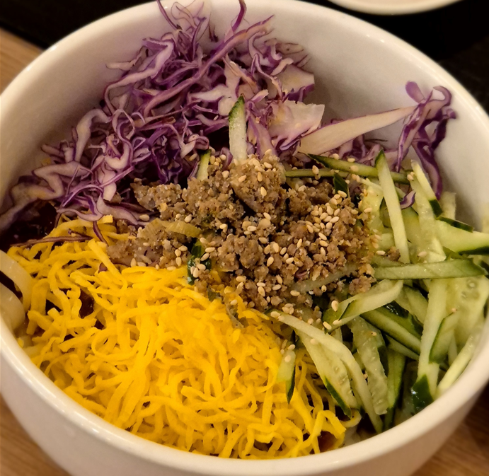 제가 주문한 비빔칼국수가 먼저 나왔습니다. 적채, 오이, 고기 고명, 계란 지단이 소복하게 쌓여 있습니다. 저는 비빔밥인가 싶었어요.ㅎㅎ