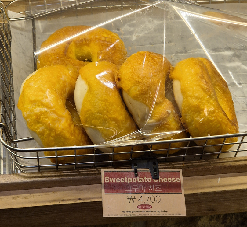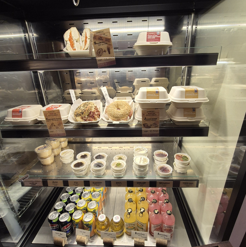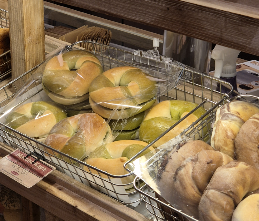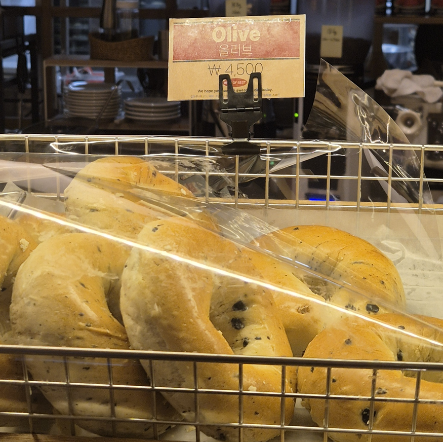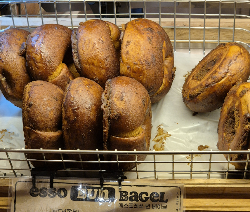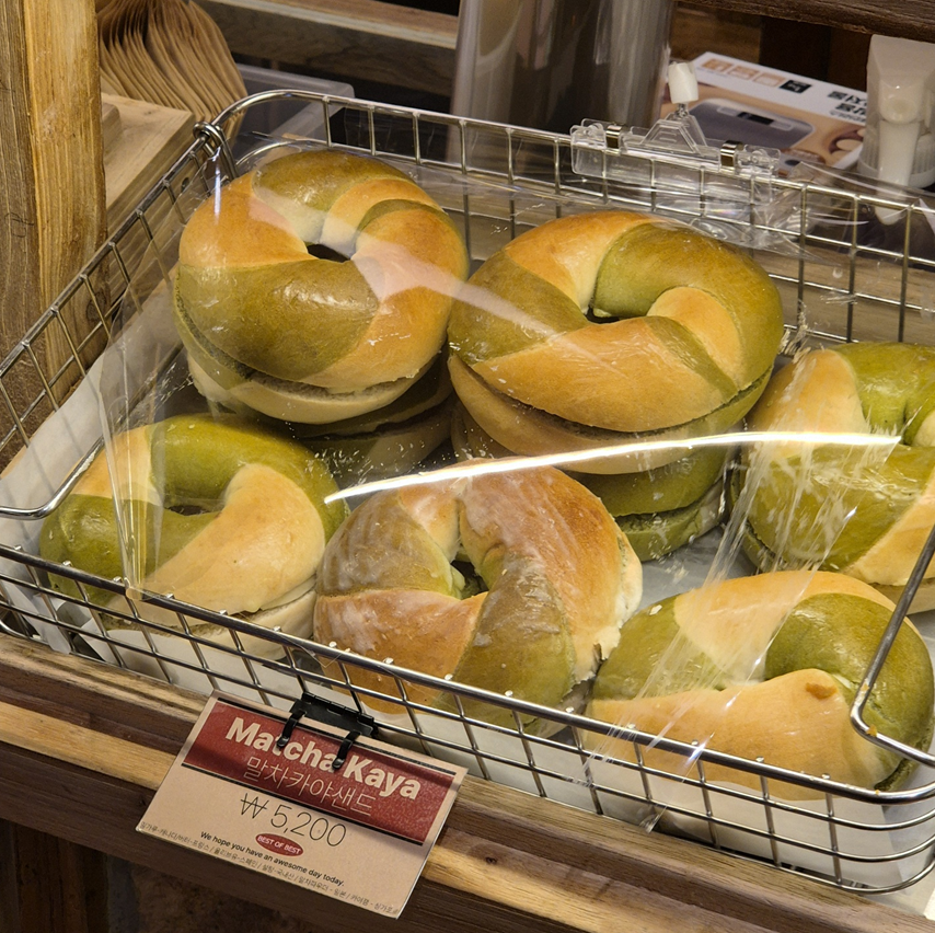 모든 베이글을 찍진 못했지만 13개 정도의 꽤 많은 종류로 준비되어 있어요.ㅎㅎ 저는 말차 카야 샌드, 소금버터, 황치즈, 에스프레소 번 베이글 4개를 구매했어요.