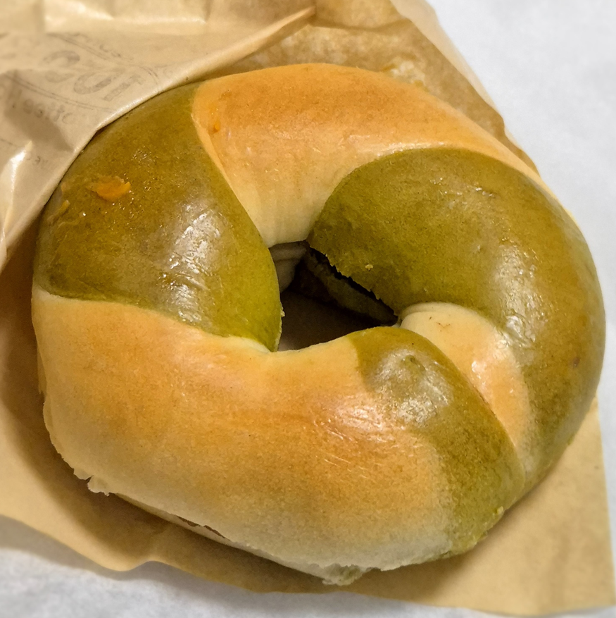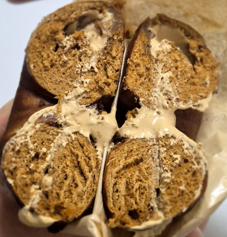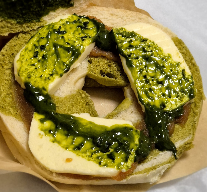 말차 베이글 사이에 카야잼과 버터, 말차 스프레드가 샌드되어 있습니다. 말차 스프레드까지 발라져 있는 줄 몰랐네요.ㅎㅎ