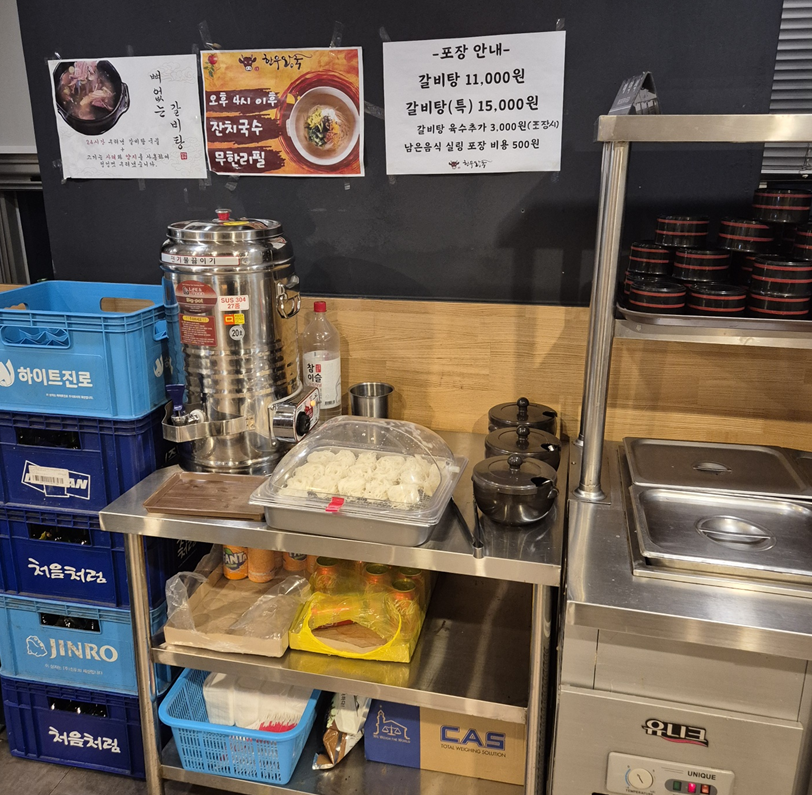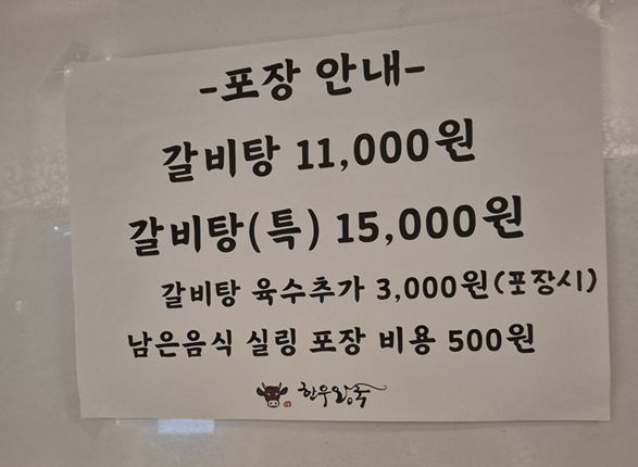갈비탕 포장은 11,000 / 15,000원입니다. 육수 추가는 3,000원이고, 남은 음식 포장도 500원이 발생하네요. 참고하세요!