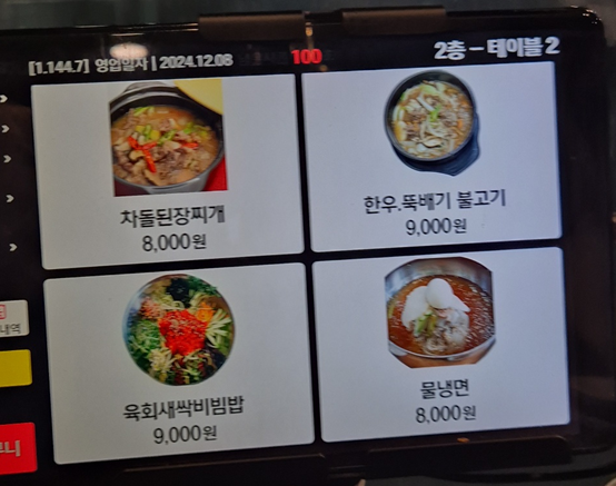 테이블마다 메뉴판이 있어 주문하기도 편합니다. 식사류/고기류/상차림, 후식/ 2층 포장 메뉴/1층판매 정육 메뉴가 있으니 참고하세요! 이 위와 아래 사진의 돼지 양념구이까지 식사, 고기류입니다.