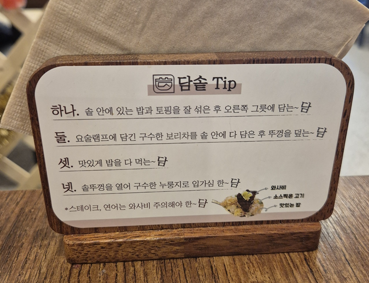 다만 아쉬웠던 것은 솥밥이 오래 끓지 않았는지 누룽지가 전혀 없어 숭늉을 해 먹지 못했습니다.ㅠㅠㅠ 그래서 스테이크 솥밥의 숭늉 맛을 느끼지 못했어요.ㅠㅠ 밥이 잘 익었는지 확인을 하셔야 할 것 같습니다. ㅎㅎ